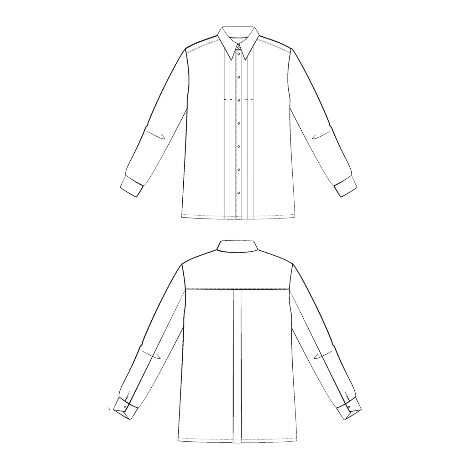 Son design : grand col aux pointes marquées, plis piqués sur le devant, pli rond dans le dos, coupe droite, intemporelle et épaule légèrement abaissée. Une version sans col, impeccablement finie par un biais, est également disponible dans le patron.