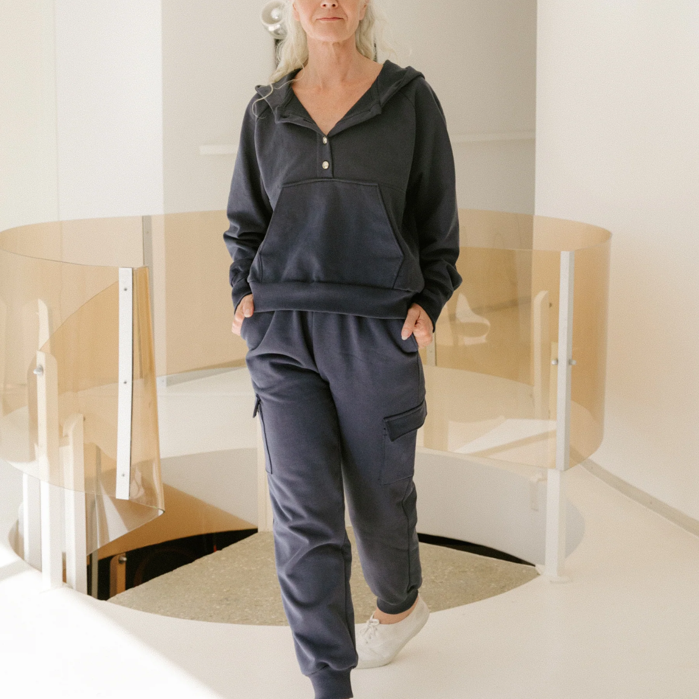Issu de la collection Nomade2025, Sasha comporte des poches italiennes et offre la possibilité d’ajouter ou non des poches plaquées à rabat sur les côtés. La jambe est droite, ni trop appuyée ni trop large, et la finition bas de jambe s’adapte à vos envies : avec un bord côte, longueur cheville ou sur le coup de pied.