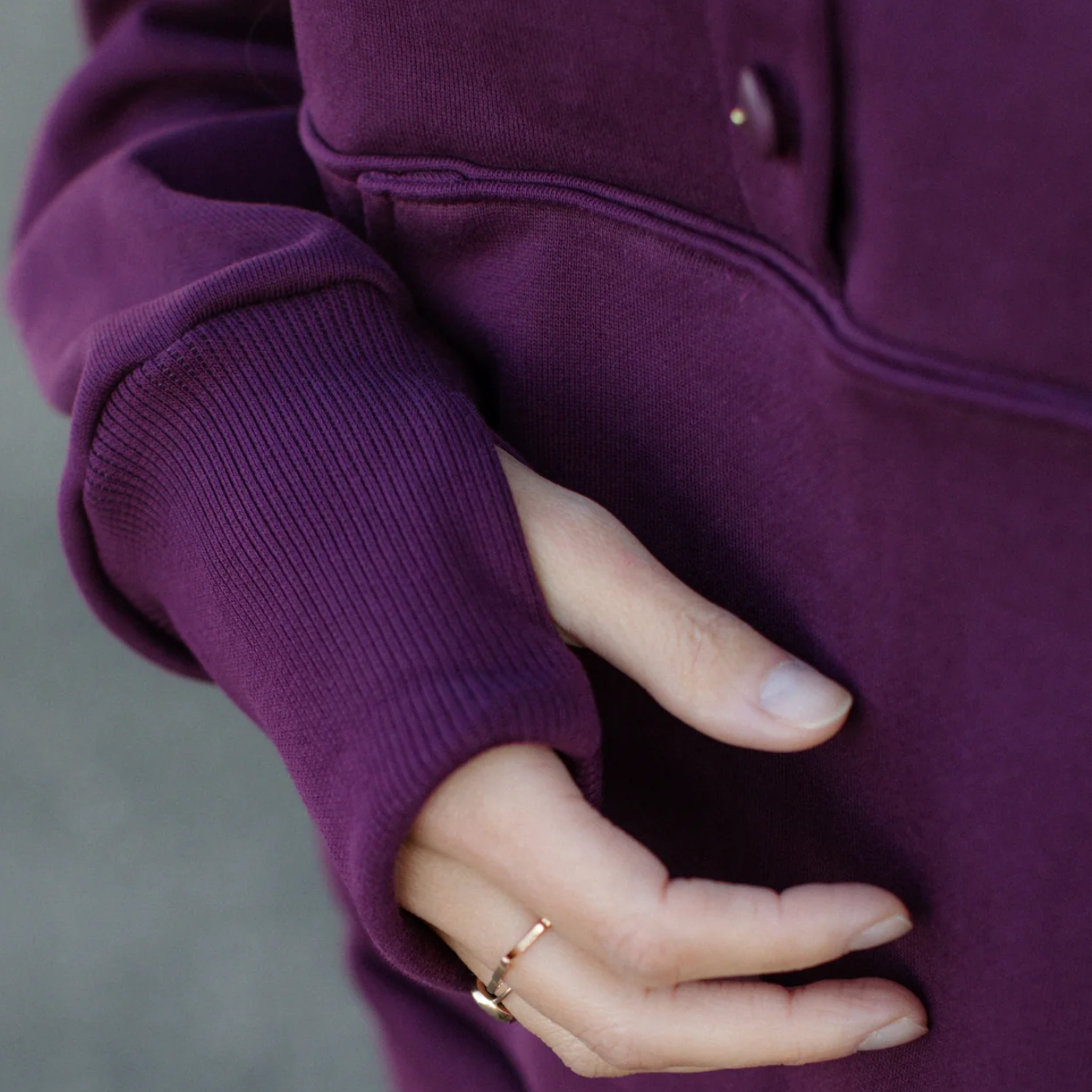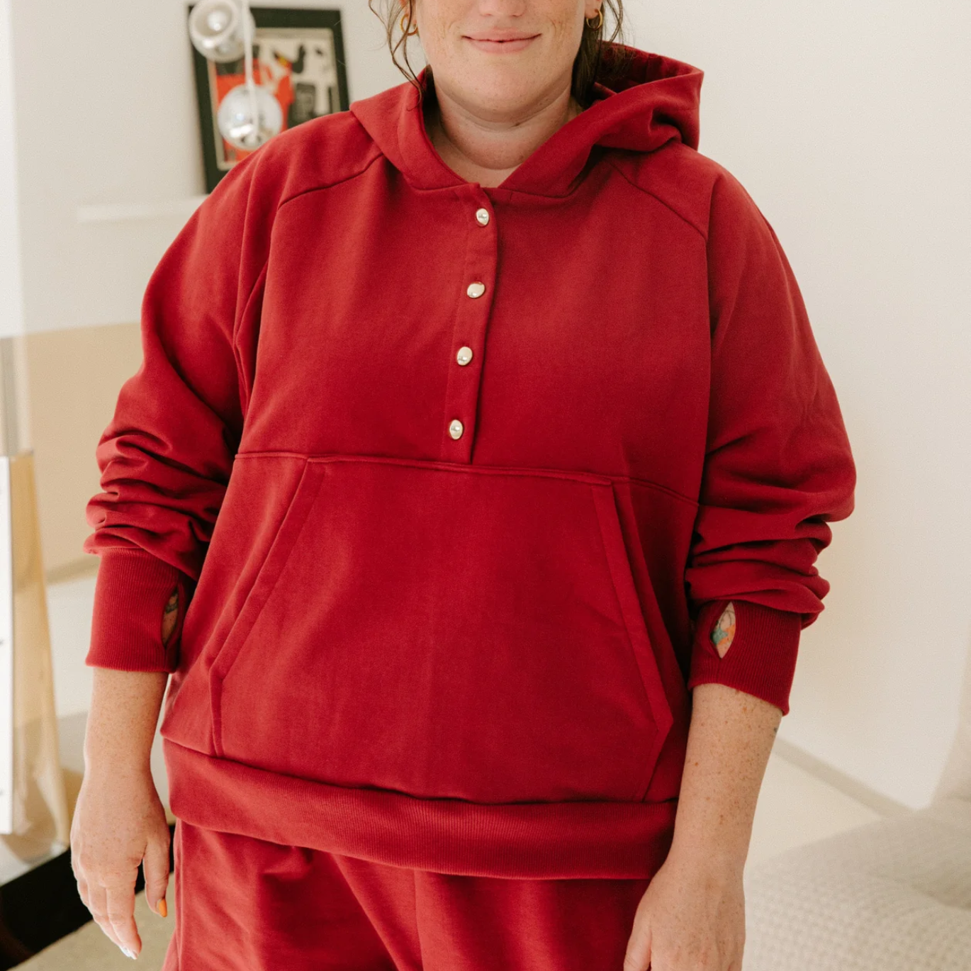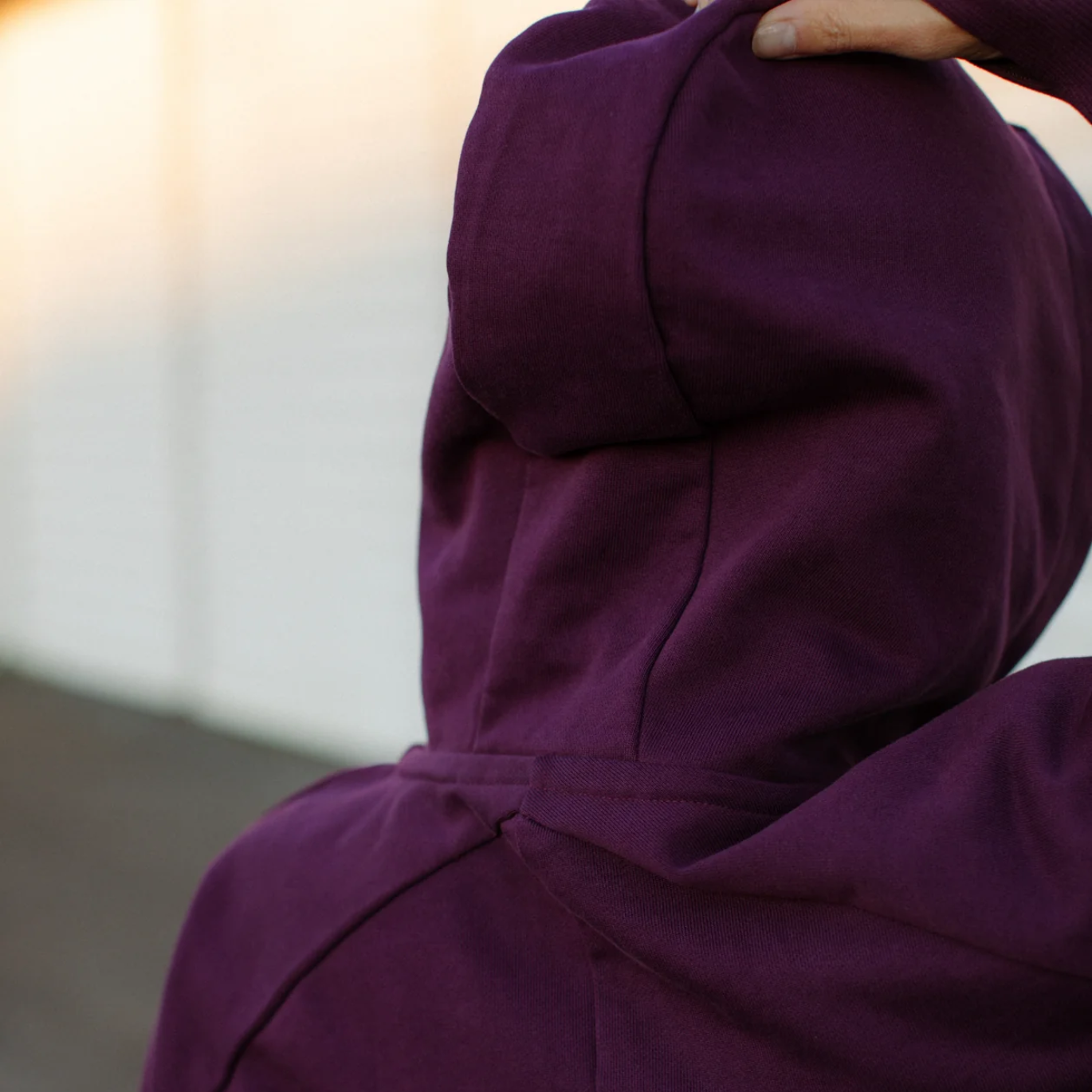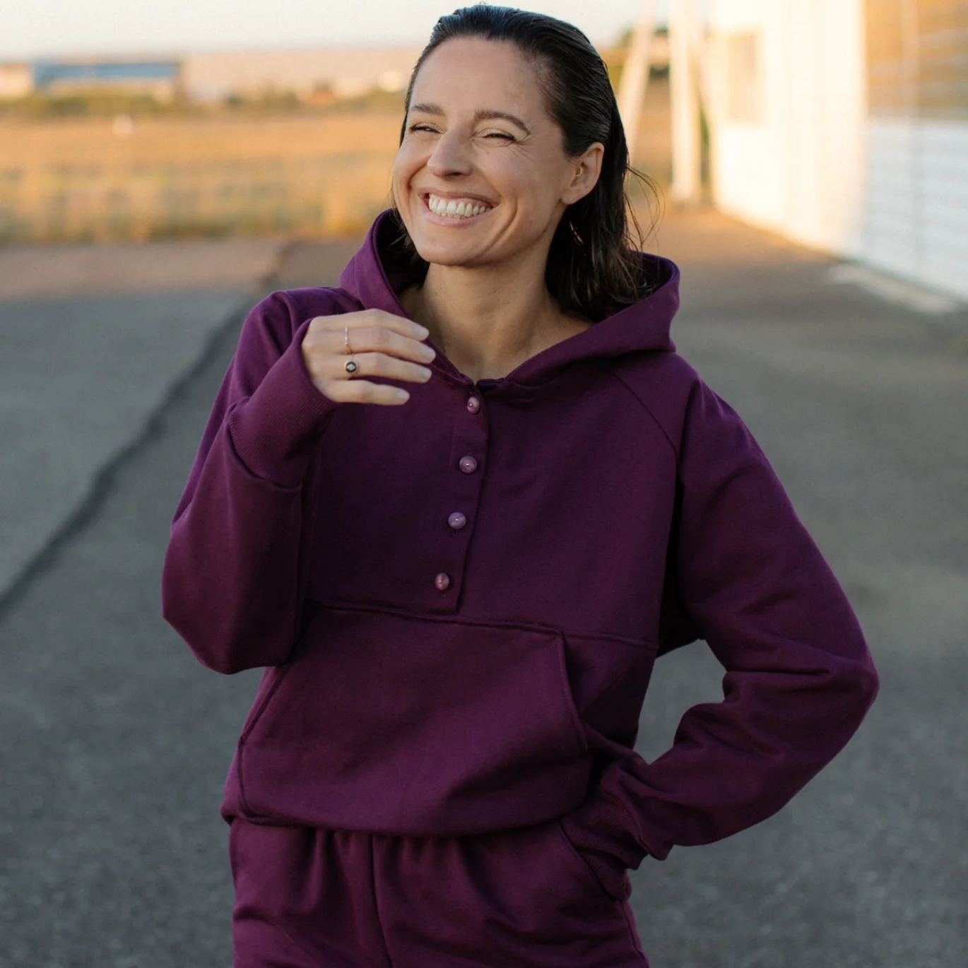 Issu de la capsule Nomade 2025, Adèle reprend les codes du sportswear avec cette touche singulière qui fait toute la différence : une grande capuche confortable et parfaitement finie, une poche kangourou généreuse, une découpe graphique dans le dos – signature de la saison chez Maison Fauve – et de longs poignets avec ouverture pour le pouce, pensés pour réchauffer les mains avec style.