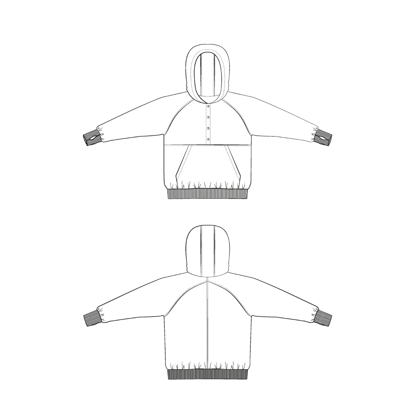 Les points techniques sont : la réalisation de la patte de boutonnage, la poche kangourou, l’assemblage des poignets avec ouverture, la capuche doublée, et la couture de la maille.