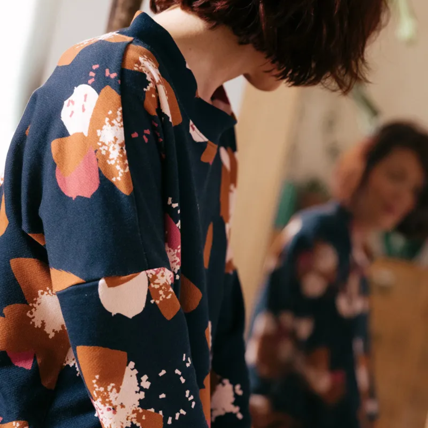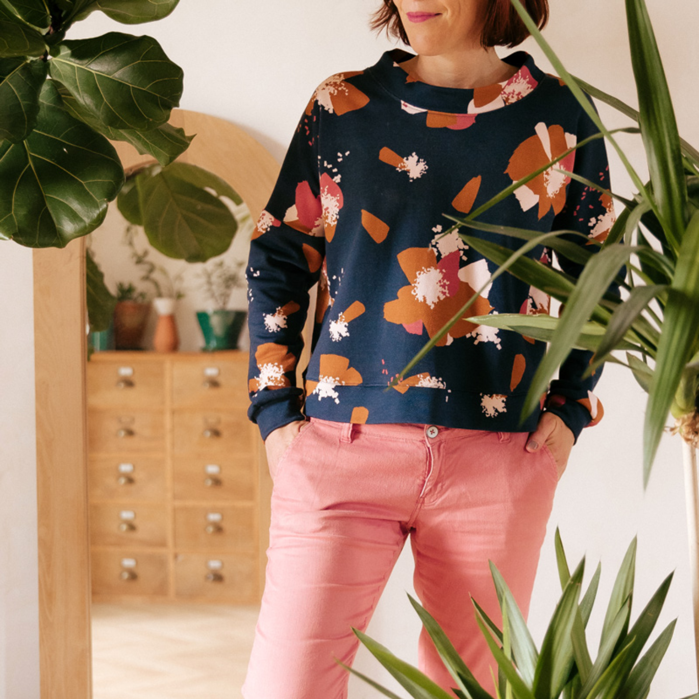 Il est moderne avec ses grandes fleurs échevelées et douillet grâce à son envers brossé. Notre sweat molleton de coton Anémona Bleu Encre a tout bon et on est déjà impatiente de se confectionner avec des joggigns, des sweats, des pyjamas et des robes pulls.