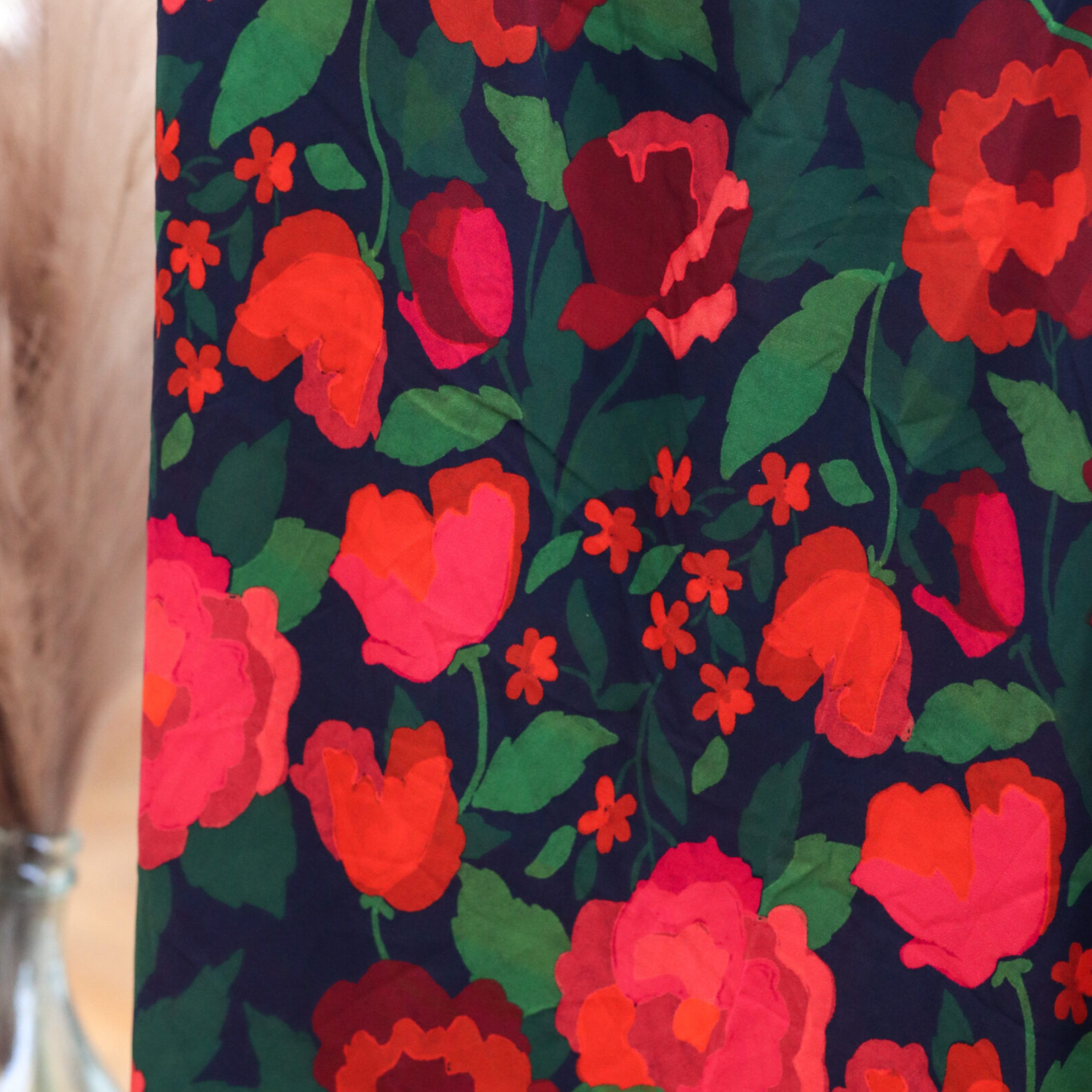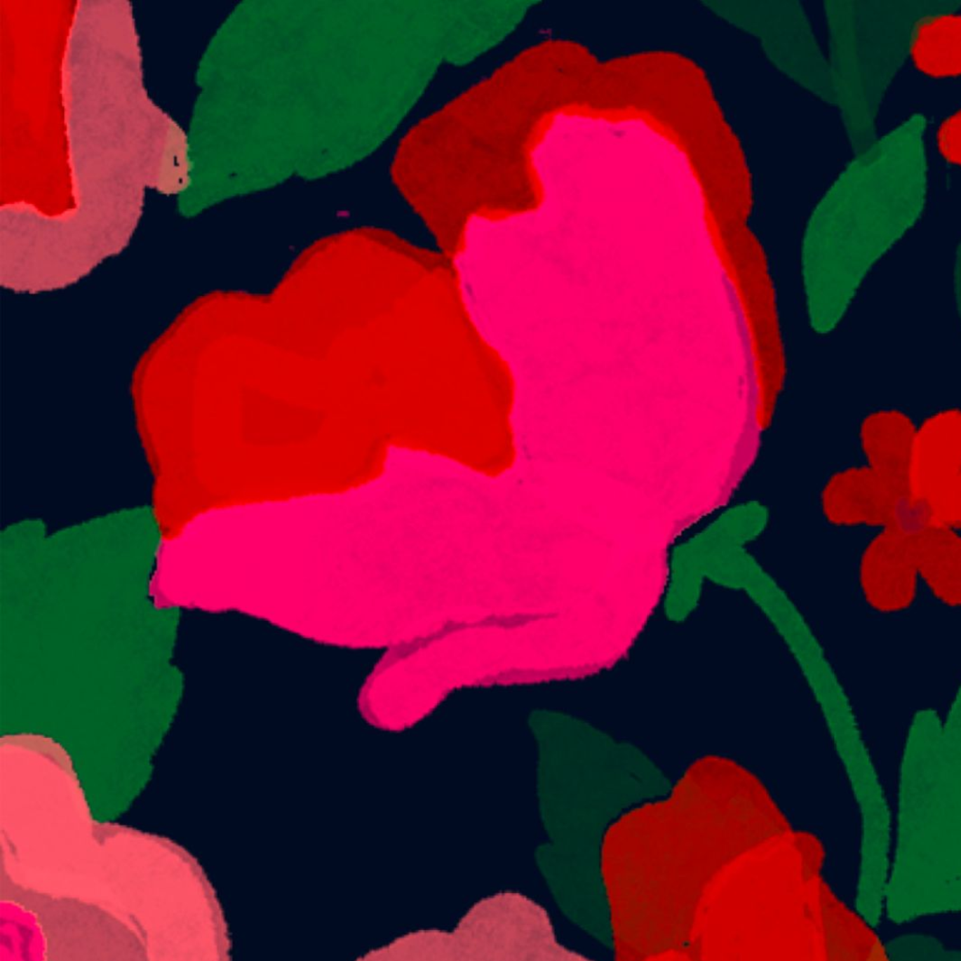 La Roseraie – De larges fleurs XXL aux teintes vibrantes de fuchsia et rouge s’épanouissent sur un fond nuit profond, comme un jardin généreux né de la pluie, quand chaque goutte donne naissance à la couleur.